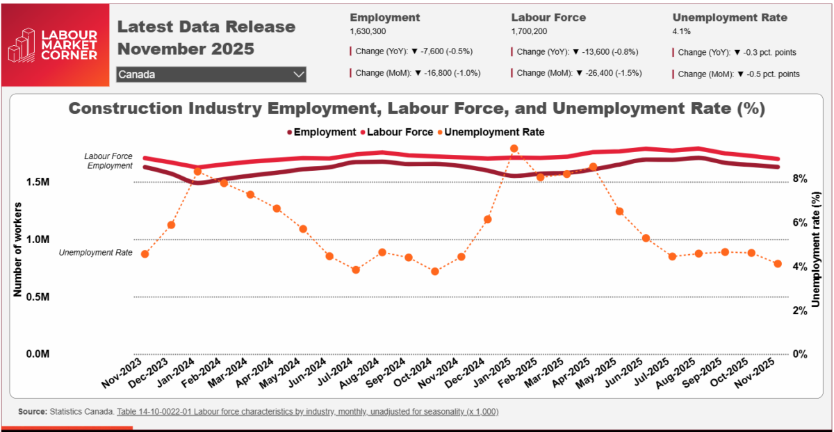 Construction employment, labour force and unemployment all declined in November as a contraction in the labour force (-13,600 workers, or -0.8%) was notably larger than a contraction in employment (-7,600 workers, -0.5%) when compared to data from November 2024. As a result, the national construction unemployment rate reached its lowest level in more than a year – at 4.1%.
