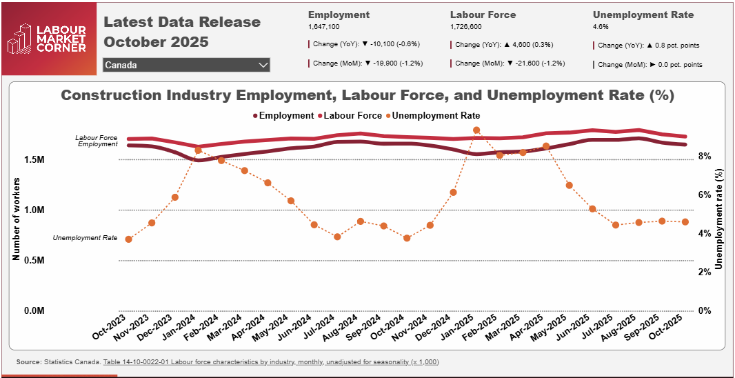 Construction employment contracted by 0.6% over the 12-month period ending in October 2025, while the labour force (those employed and those seeking employment) rose by 0.3%.